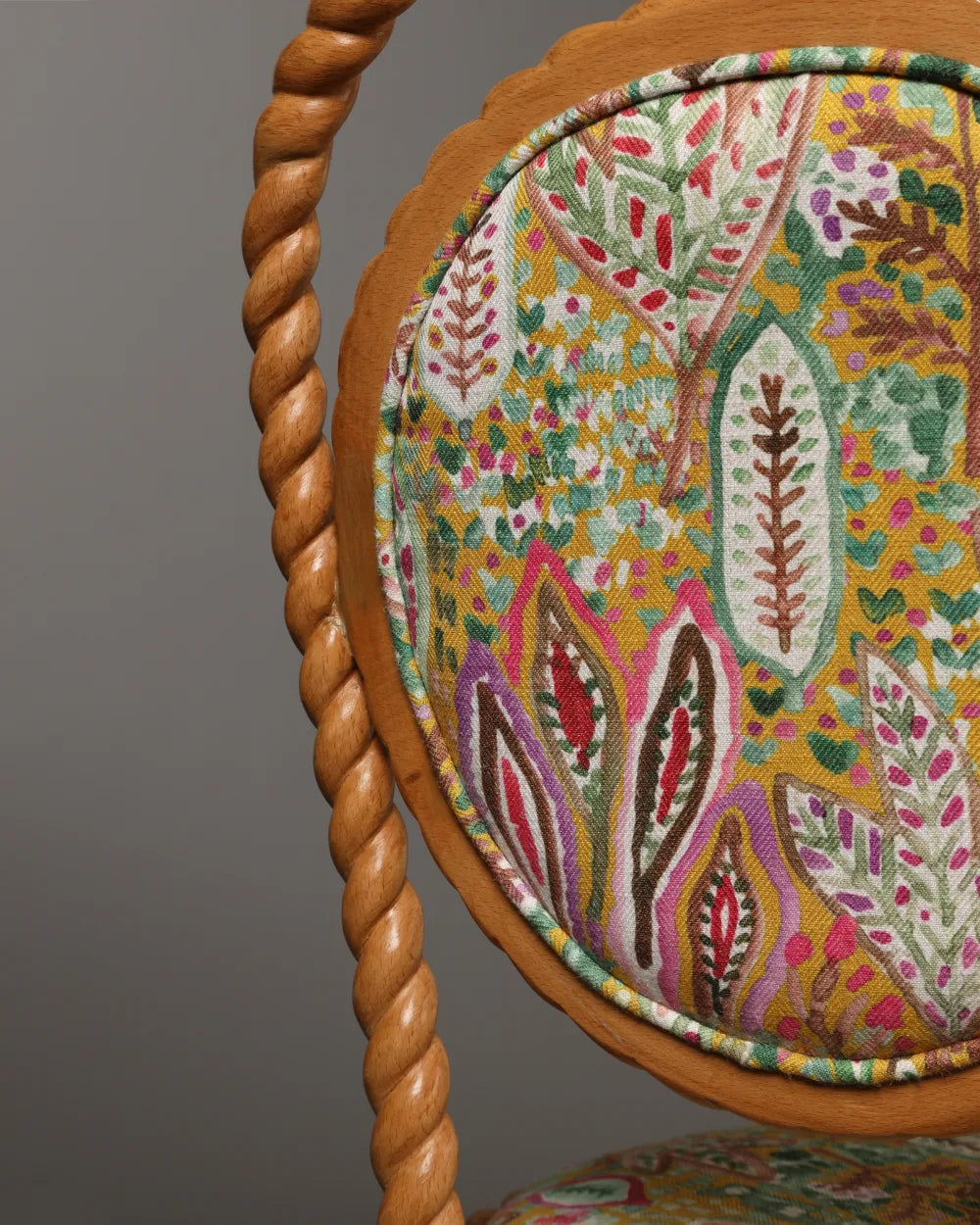 The natural rhythm of the braid contrasts beautifully with the smooth beech frame, creating a harmony between structure and softness. Supportive yet lightweight, the braided details adds a touch of ease to the chair’s refined profile. The colourful textile seat introduces warmth and modernity, finished in a natural polish, the piece remains light, airy, and tactile.