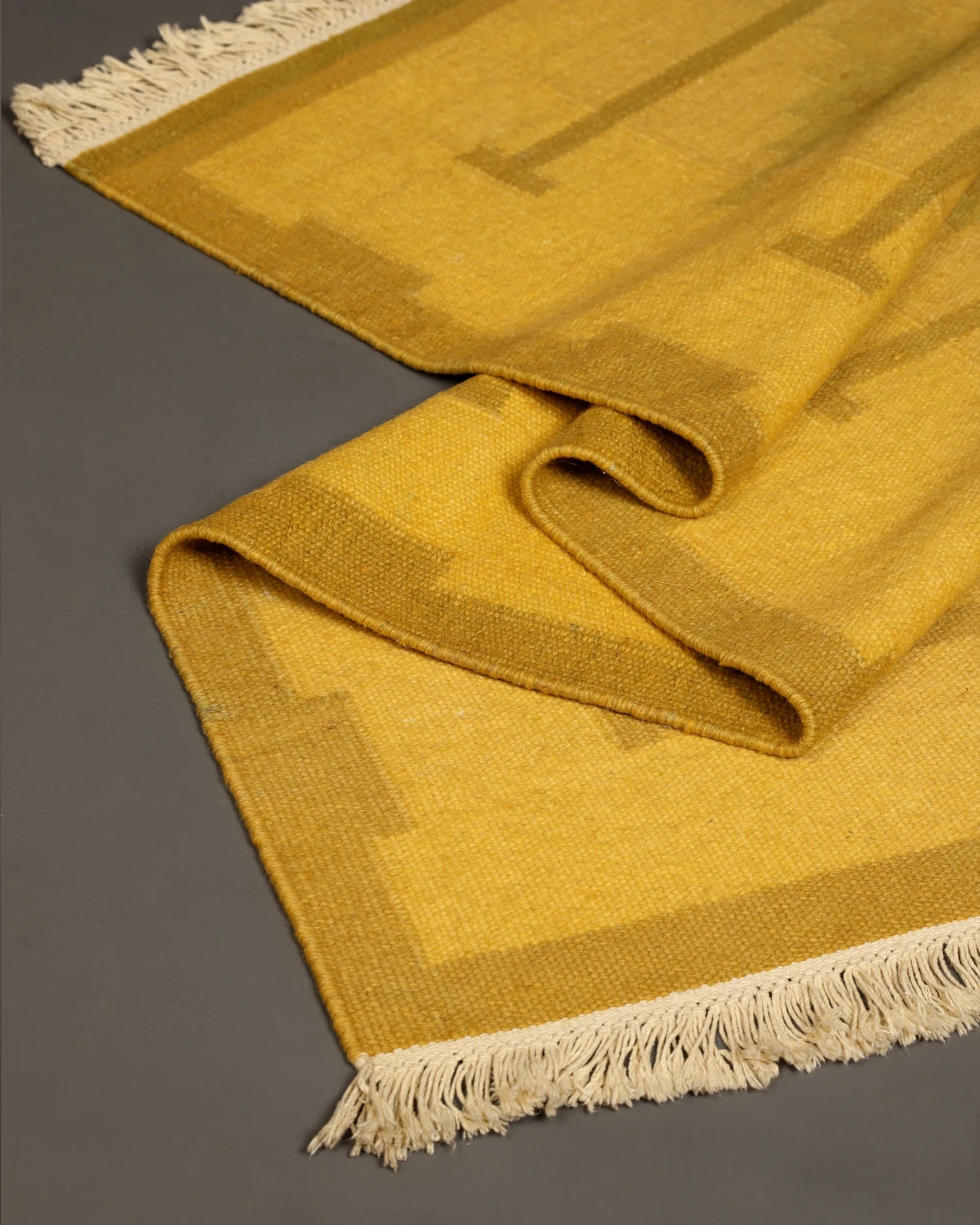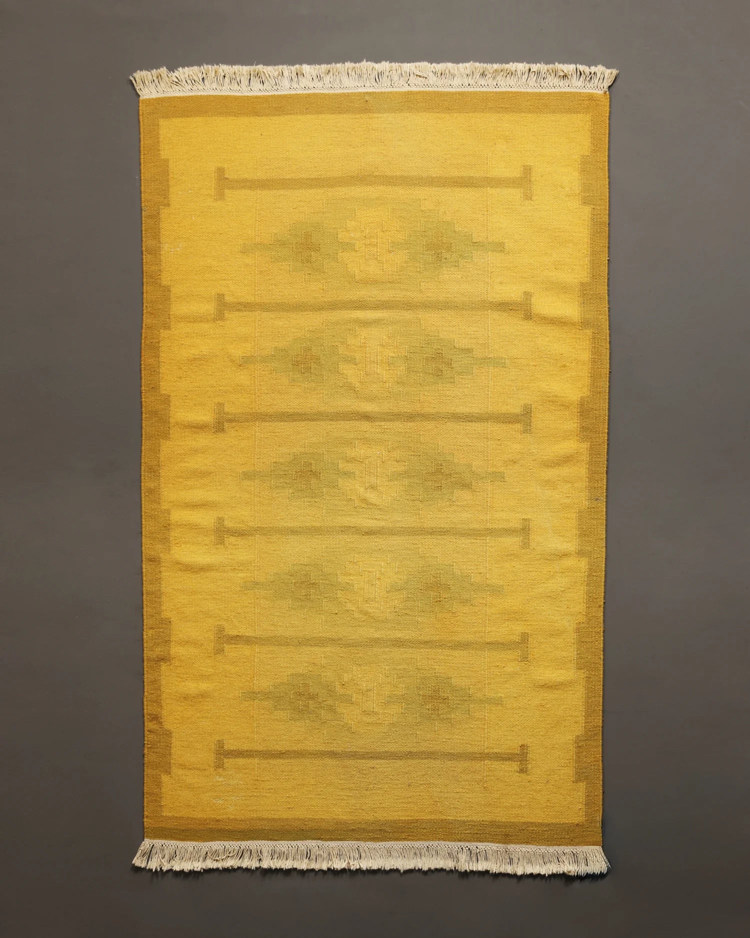 The Sarson Kilim introduces a field of warm mustard into the room, defined by soft-edged geometry that lends the pattern a measured, relaxed clarity. Handwoven as a traditional flatweave, it is lightweight, reversible, and tightly constructed for everyday use.