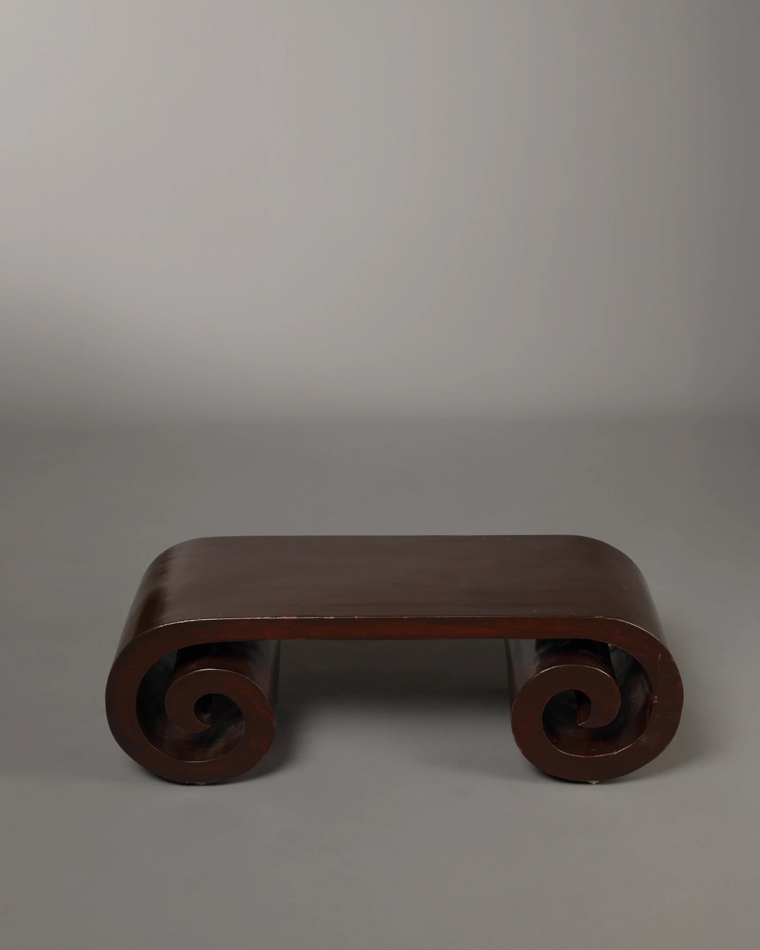 The Ancestry Volute Low Table is shaped as a modern scroll, its profile formed by a single, continuous volute that curves forward and returns in one resolute gesture. The table is made from single-ancestry salvaged teak, each length of the timber cut from the same reclaimed source to preserve uninterrupted grain, tone, and structure.