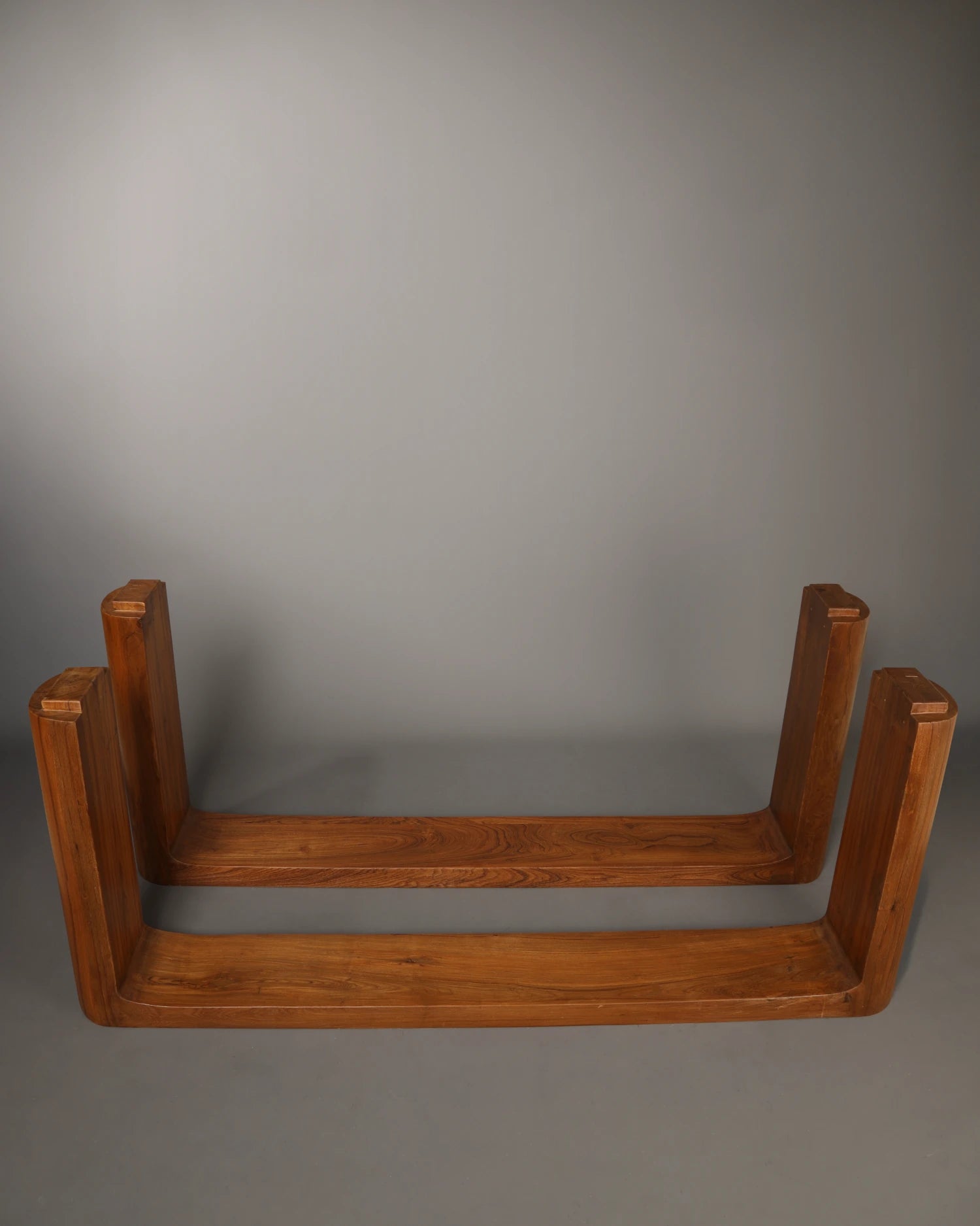 Beneath, the base reveals the table’s architectural ambition. Two inverted console-like forms - substantial enough to stand alone as six-foot pieces - carry the weight of the top with a presence that is both grounded and elevated. Their semi-circular, pillar-inspired columns give the table its unmistakable stance: bold, balanced, and unshakeably sure of itself. The table extends its generosity downward, the underside of each console becomes a natural resting point for the feet, offering comfort most tables never consider.