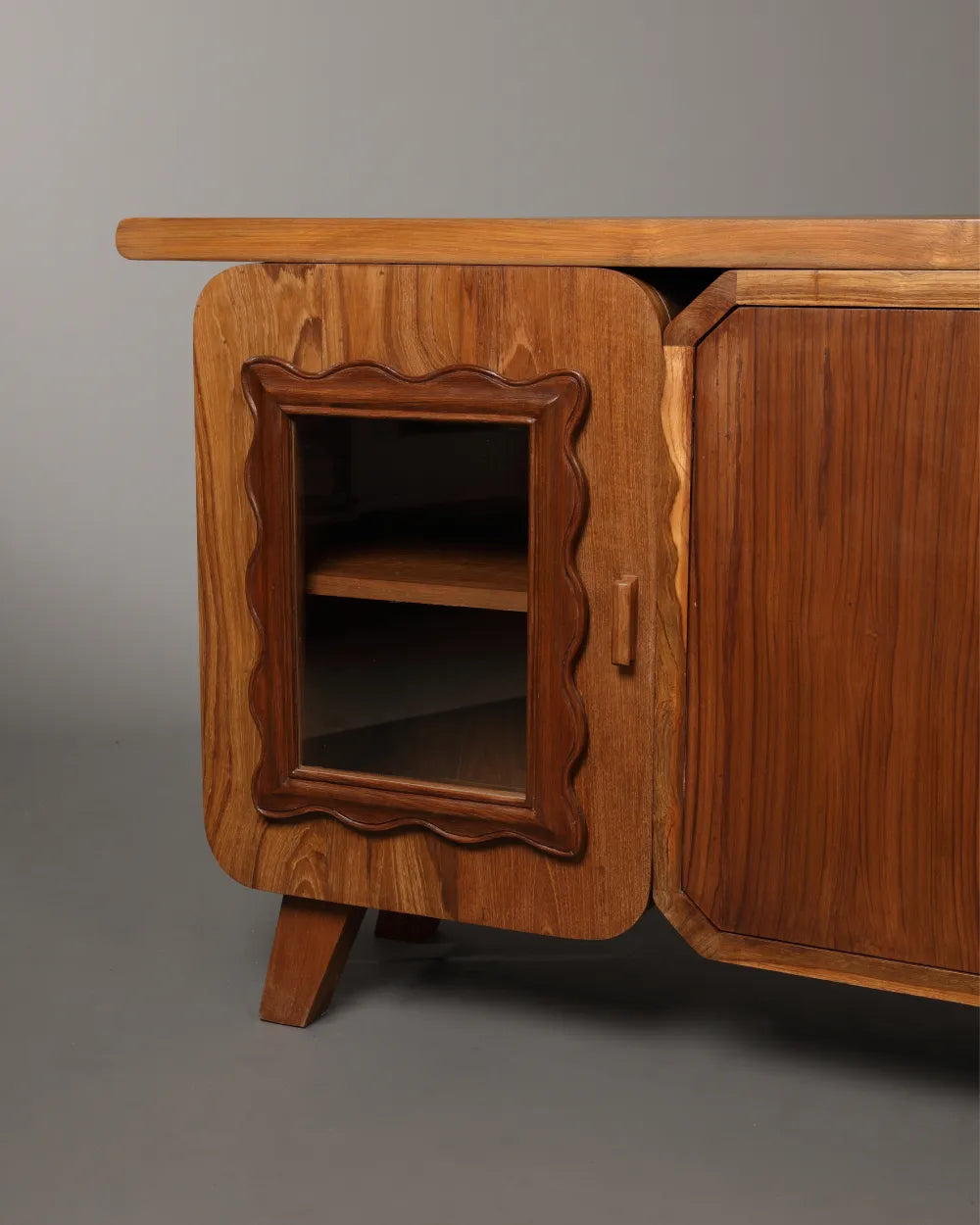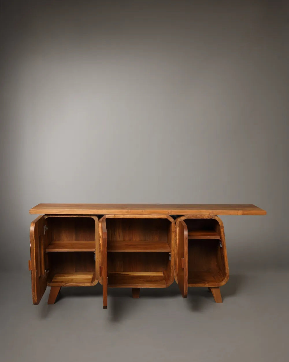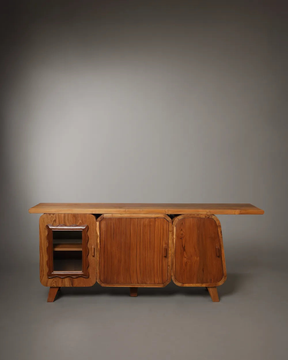 Crafted in solid teak with an intentionally natural, raw-touch finish, the Cabinet highlights the material’s true character. Subtle grain variations, tonal shifts, and natural imperfections remain visible, giving the piece an honest, approachable presence.