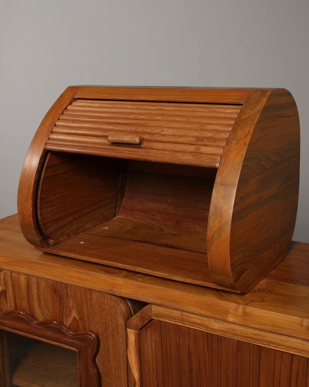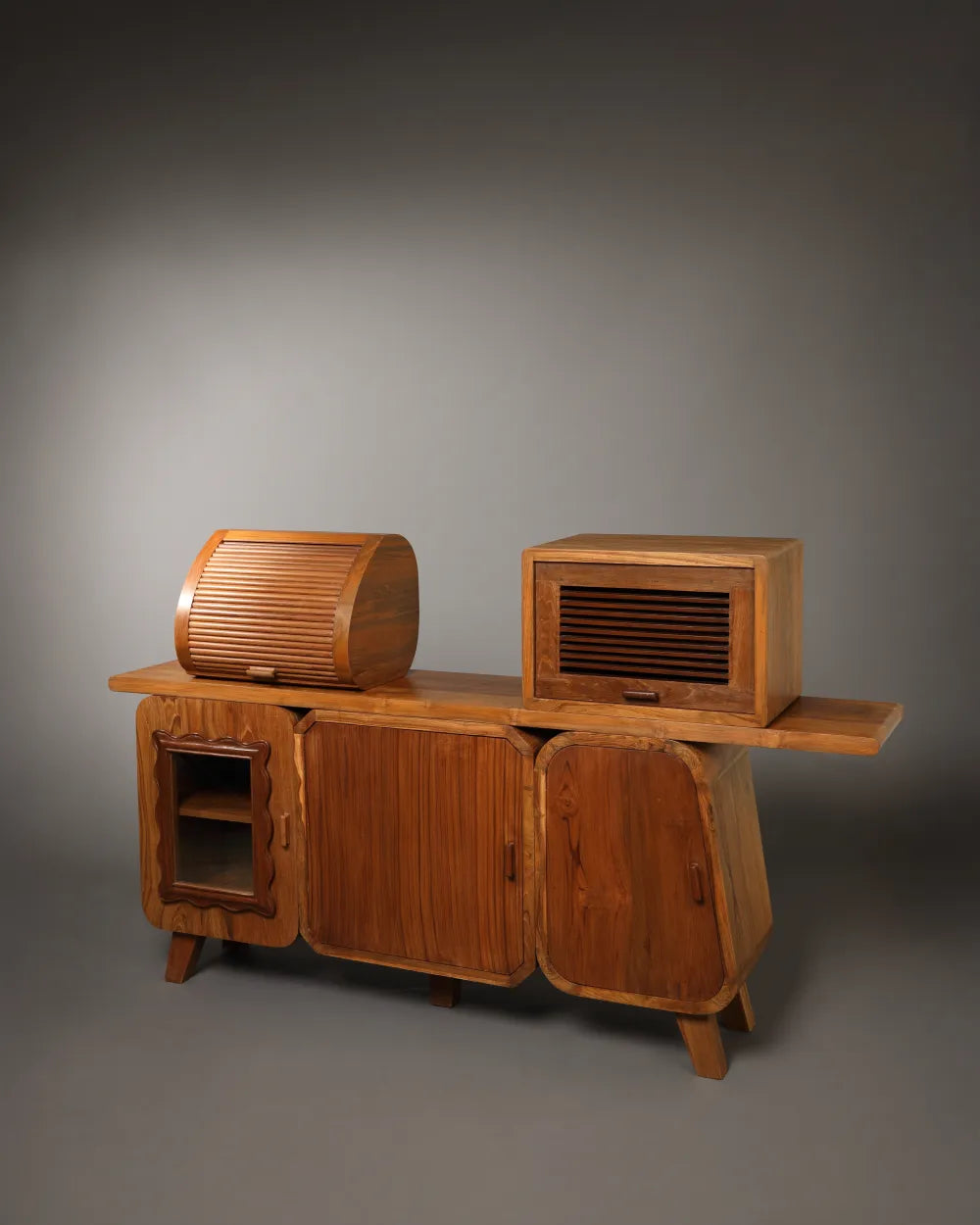 The Storied Vault celebrates the architectural ingenuity of vintage storage forms, reinterpreted in a clean, modern language. Its structure draws directly from the rounded fronts of old transistor radios, the practical slide of classic breadboxes, and the compartment logic of writing desks with roll-top and sliding covers. The result is a cabinet that feels grounded in history while looking distinctly contemporary.